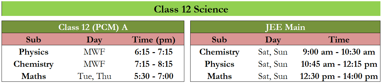 Our Class 12 Chemistry classes are conducted on Mon, Wed, Fri from 7:15 pm to 6:15 pm. |