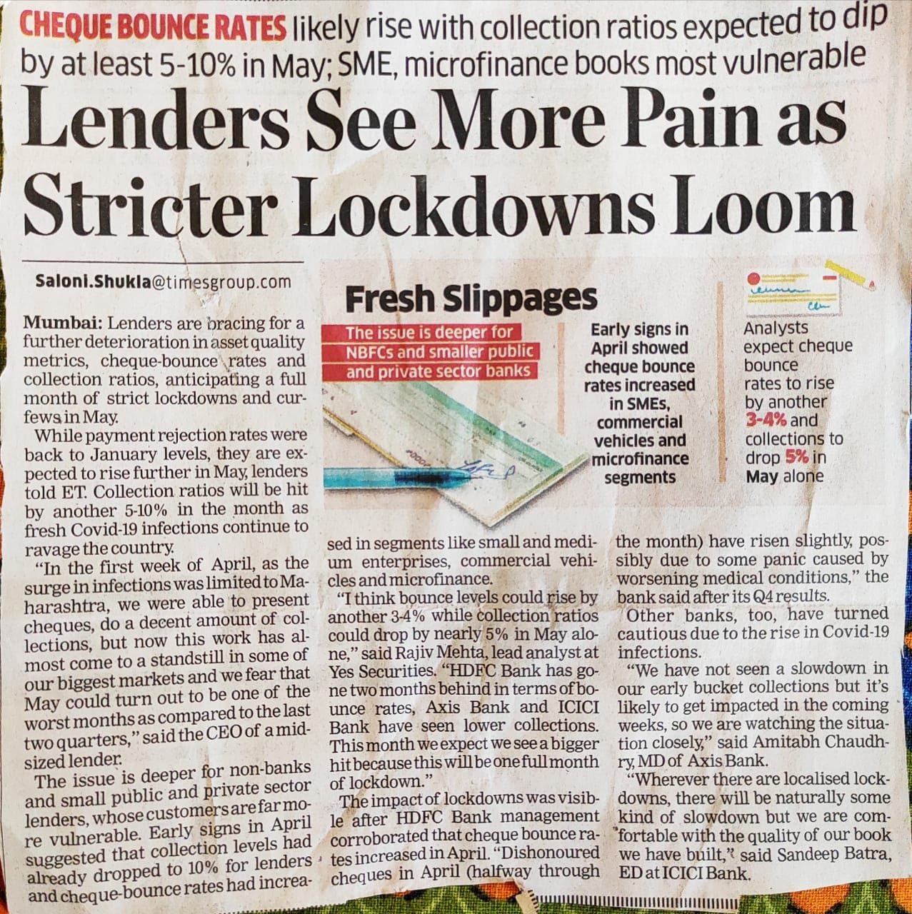 Impact on Banking sector due to Lockdown – Cheque Bounce rate & Collections Rate